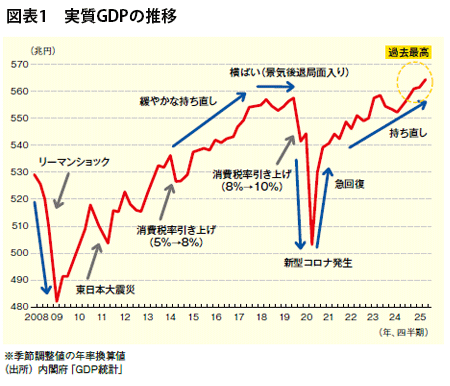 2025年の日本経済は、米国トランプ大統領による通商政策(いわゆる「トランプ関税」)に翻弄されながらも緩やかな回復が続いた。特に前半は24年からの緩やかな回復傾向が継続し、国内で生み出された付加価値の総額を表す実質GDPは24年4~6月期から25年4~6月期まで5四半期連続で増加した(図表1)。トランプ関税の本格適用を前にした米国向けの駆け込み輸出が盛り上がったこと、企業の設備投資も堅調に増加したこと等から、実質GDPは四半期の水準としても過去最高額の更新を続けた。その後、夏場から年後半にかけてはトランプ関税の悪影響が本格化し、日本から米国に向けた輸出が駆け込みの反動もあって一段と減少するなど次第に景気の減速感は強まっていったが、MURCでは25暦年の実質GDPは前年比+1.0%(25年9月時点の予測値)と、24暦年の同+0.1%を上回り、5年連続のプラス成長で着地すると見込んでいる。