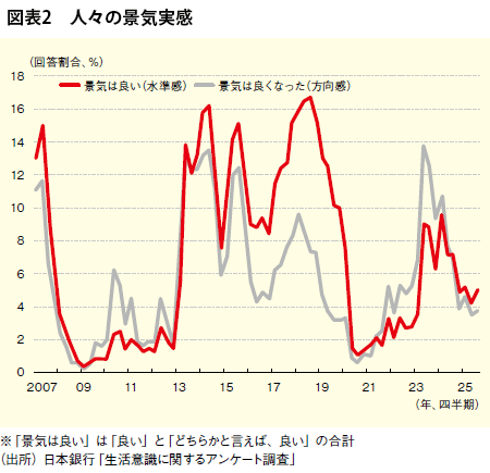 もっとも、こうしたGDPや金融市場の好調さとは裏腹に、人々の景気実感は改善するどころか、むしろ悪化へ向かった。日本銀行が全国20歳以上の男女約4000人を対象に実施した「生活意識に関するアンケート調査」(25年9月調査)によると、景気が「良い」もしくは「どちらかと言えば良い」と答えた割合は5%と1割にも満たなかった上、前年同期と比較して2.2ポイントも低下した(図表2)。これは景気の水準に対する設問への回答だが、1年前と比べた方向感に関する設問への回答を見ても、景気が「良くなった」との回答は3.8%と低く、前年同期と比べて3.1ポイントも低下した。この意味で25年の日本経済は、いわゆる「実感なき景気回復」が進んだ1年だったと振り返ることができる。