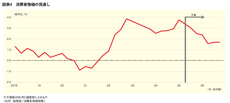 春闘での高い賃上げが継続するとみられることもプラス材料である。「ESPフォーキャスト調査」(25年9月調査)※によれば、主要大手企業による25年の賃上げ率(実績)が5.52%だったのに対し、民間エコノミストによる26年の予測値は4.81%と前年より縮小するものの高めの賃上げが続くとされている。