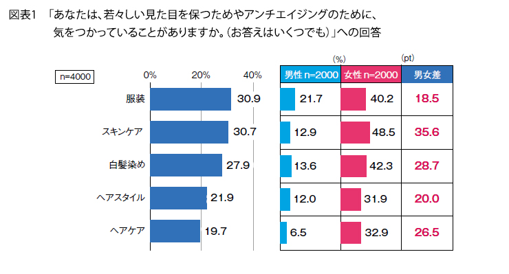 アンチエイジングのために気をつかっていることの結果は、上位より「服装」(30.9%)、「スキンケア」(30.7%)、「白髪染め」(27. 9%)となり、男女別ではすべて女性が上回っています(図表1)。