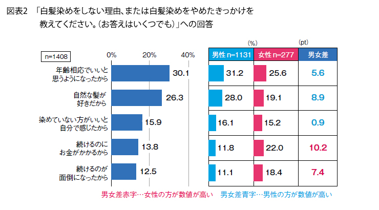 白髪を染めない理由、やめた理由は、多い順に「年齢相応でいいと思うようになったから」(30.1%)、「自然な髪が好きだから」(26.3%)、「染めていない方がいいと自分で感じたから」(15.9 %)、「続けるのにお金がかかるから」(13.8%)、「続けるのが面倒になったから」(12.5 %) となっています( 図表2)。「続けるのにお金がかかるから」と回答したのは男性が11.8%、女性は22.0%でしたが、この男女差は、美容室やサロンの利用の有無が関係しているのかもしれません。