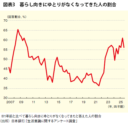 景気回復に人々の実感が伴っていない理由のひとつに、暮らし向きの悪化がある。同じ日銀の調査によると、1年前と比べて暮らし向きにゆとりがなくなってきたと答える人々は56.1%と半数以上に上り、2000年代後半に生じたリーマン・ショック後に近い水準にまで悪化している(図表3)。ただ、今回、特徴的なのは、その主な理由として所得の減少よりも物価高が挙げられている点だ。複数回答が可能な中で、当時は「給与や事業などの収入が減ったから」との回答が約7割に上る一方、「物価が上がったから」との回答は約3割だった。しかし足元では「給与や事業などの収入が減ったから」との回答は約3割の一方、「物価が上がったから」との回答は約9割と逆転している。